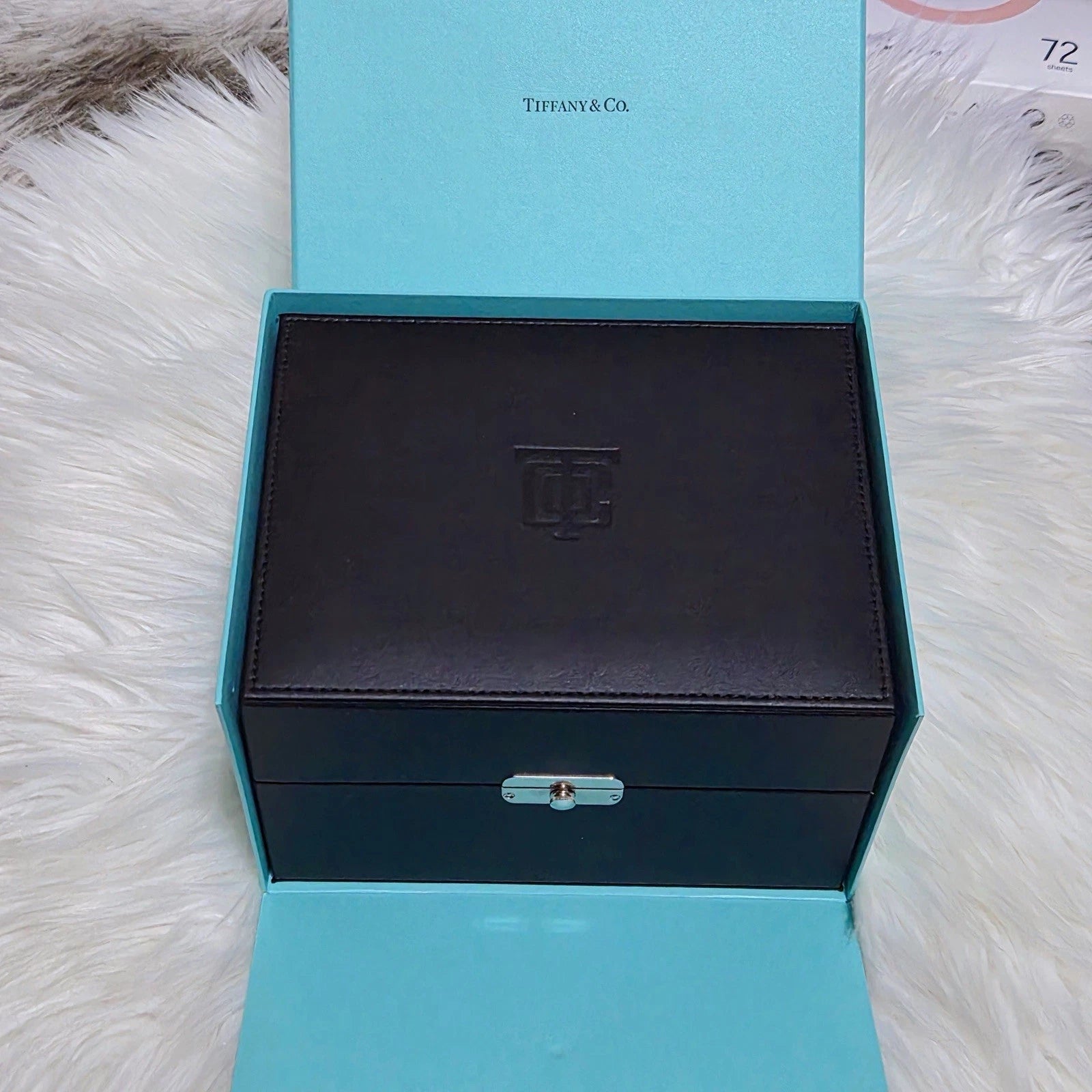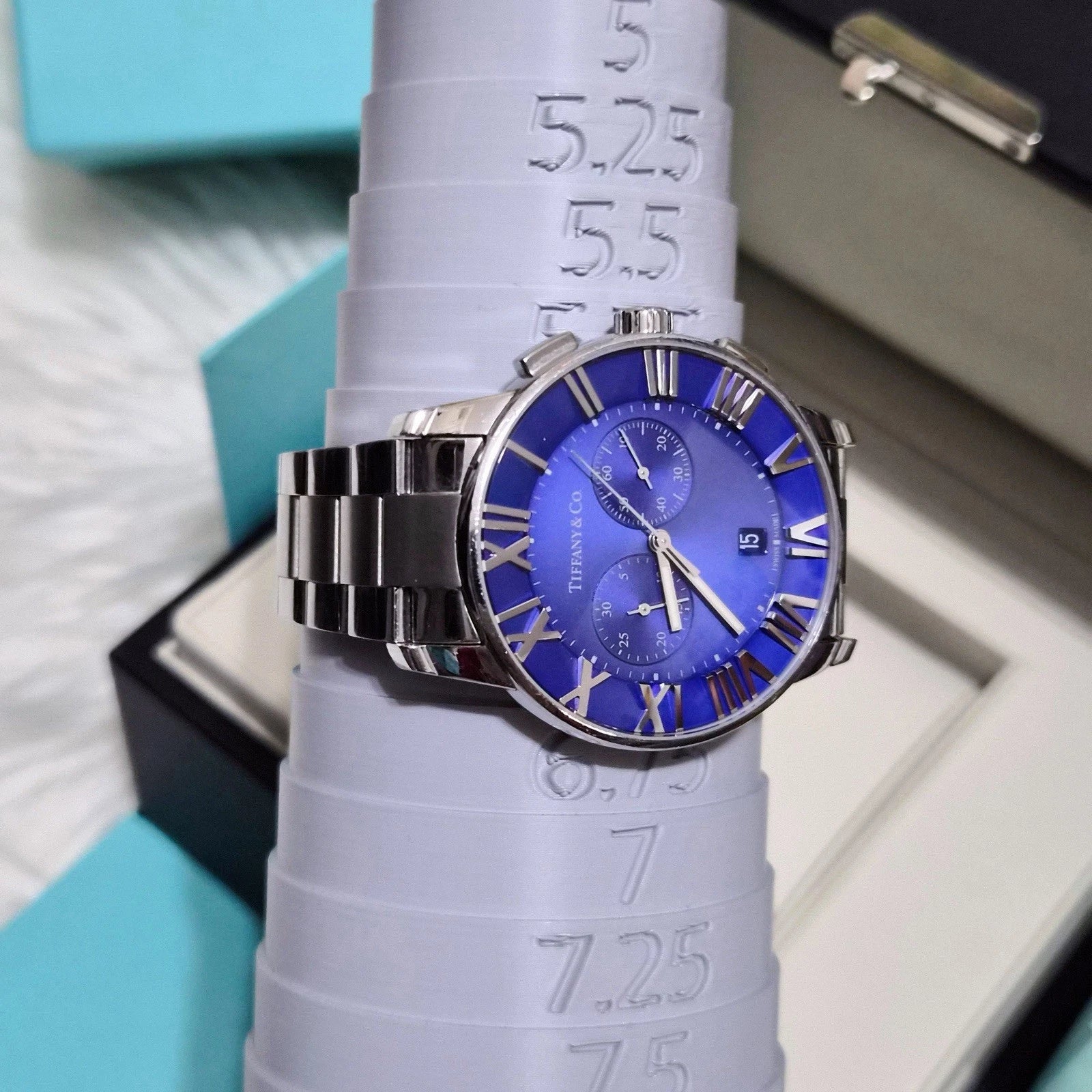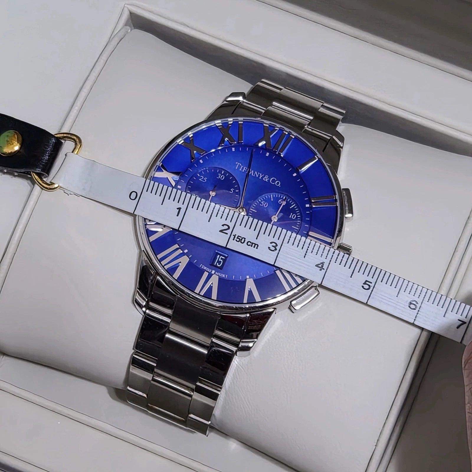 Authentic Tiffany & Co. Atlas Chronograph watch featuring a striking blue dial with signature Roman numeral hour markers. This elegant and sporty timepiece combines stainless steel construction with 18k white gold accents, offering a refined two tone look that is both versatile and timeless.