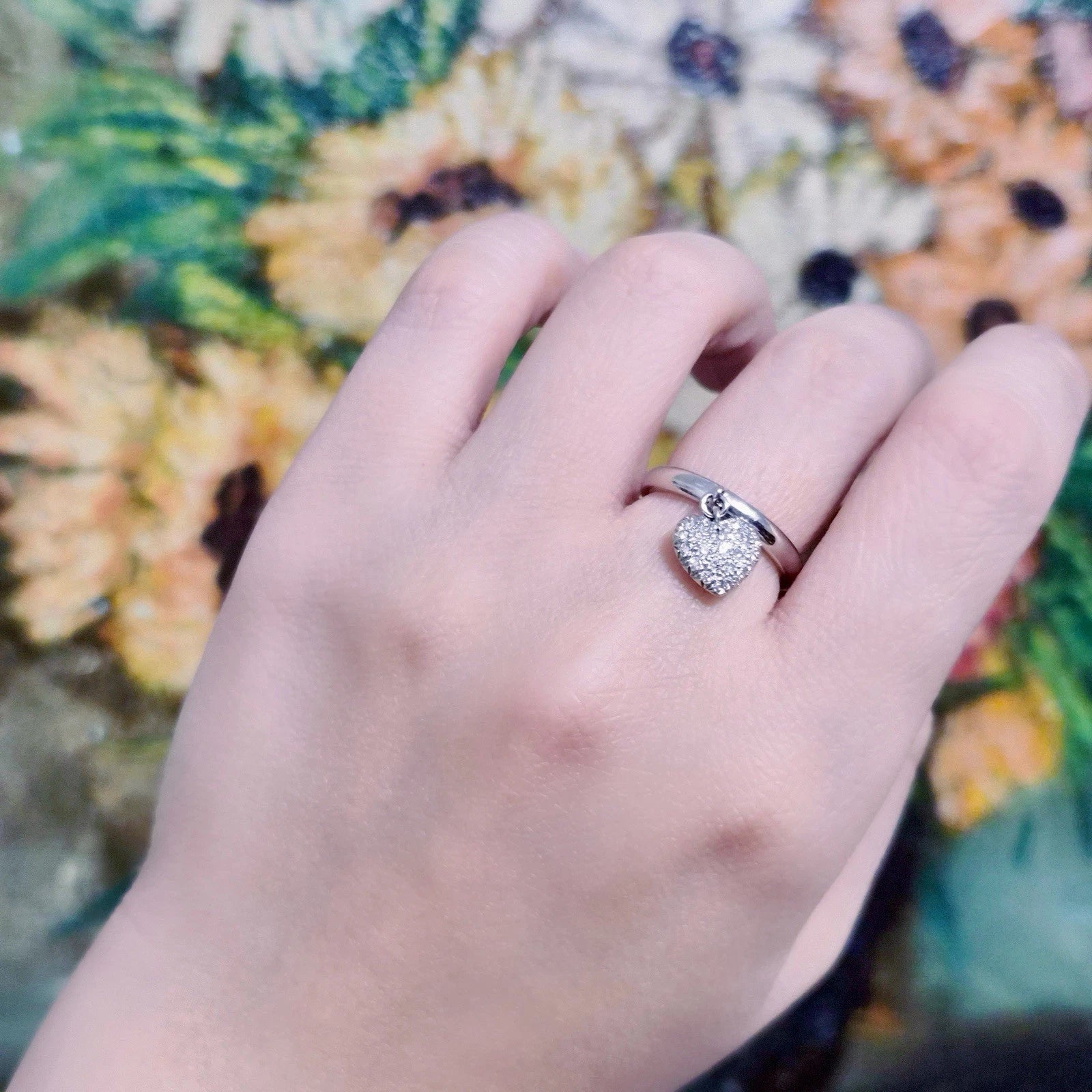 Elegant Tiffany and Co diamond dangle heart ring featuring a polished band with a heart charm that moves freely and catches light with every motion. The heart is fully set with bright round diamonds (approx. 0.17 tcw), giving it a shimmering, sparkling look that feels playful, feminine and luxurious.