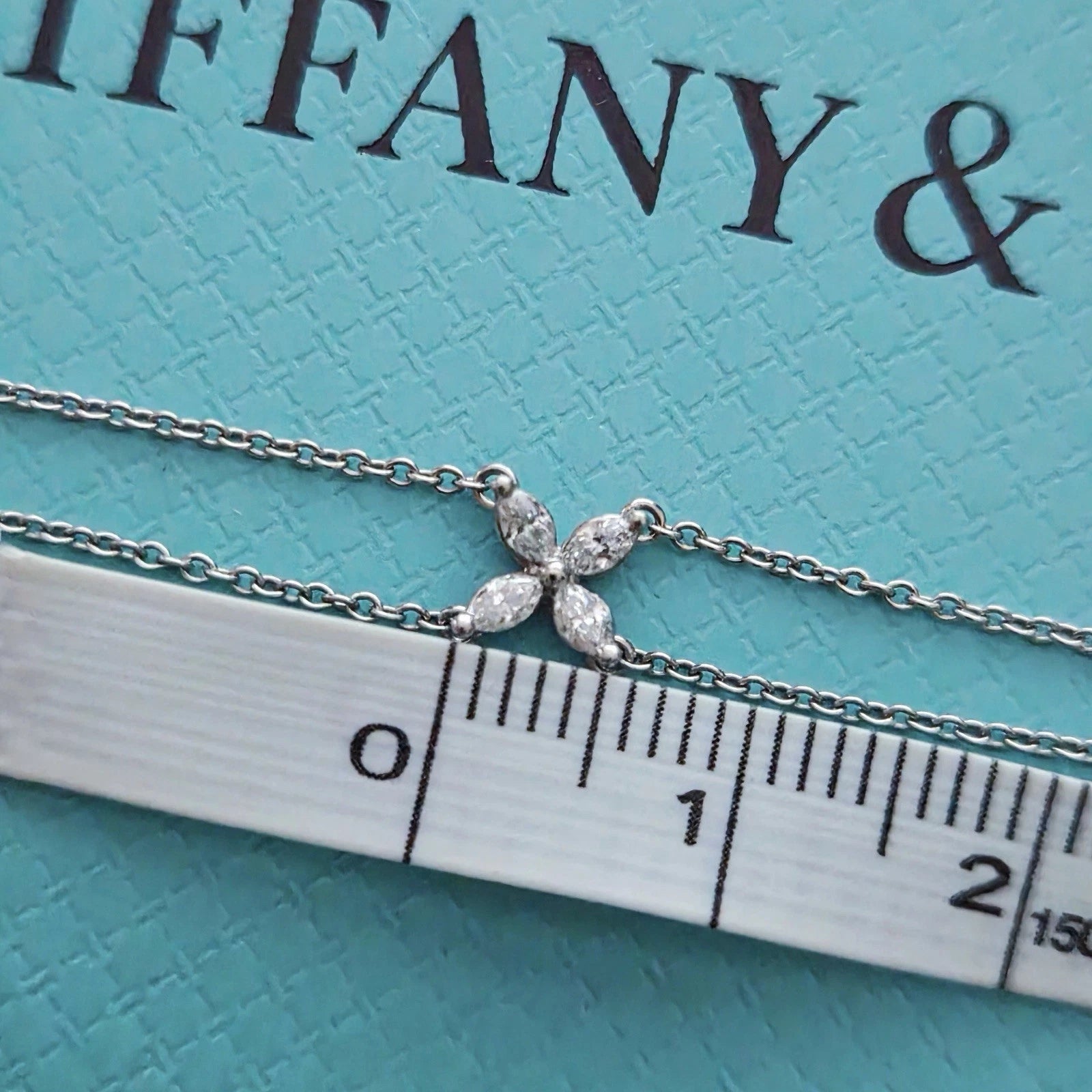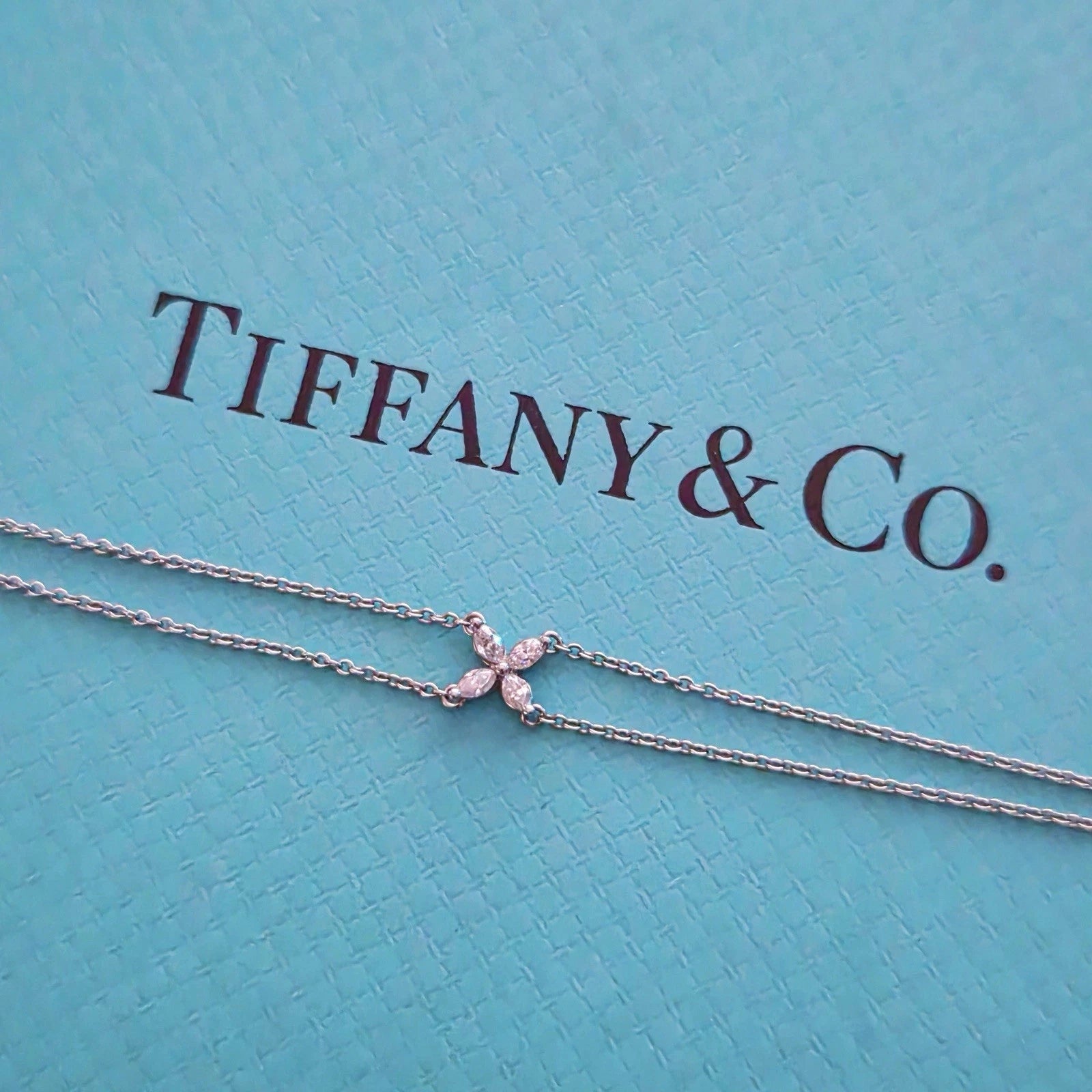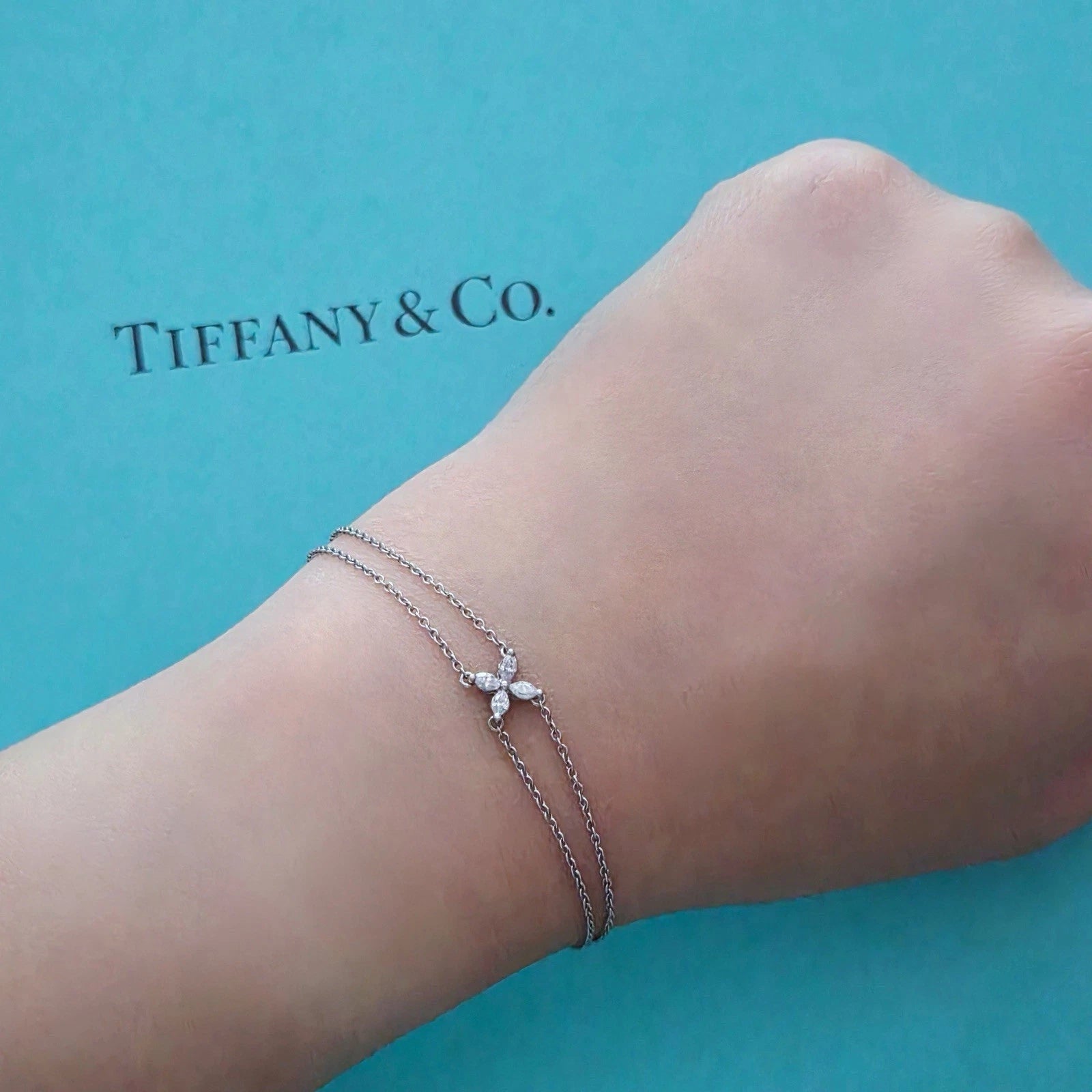 Authentic Tiffany & Co. Victoria bracelet crafted in platinum with a double chain design. The signature Victoria motif features four marquise diamonds arranged in a floral shape with beautiful brilliance. This is small size and the style has been retired, making it highly collectible. The bracelet sits delicately on the wrist and sparkles elegantly in natural light. A stunning Tiffany & Co. diamond piece that is perfect for daily wear or special occasions.