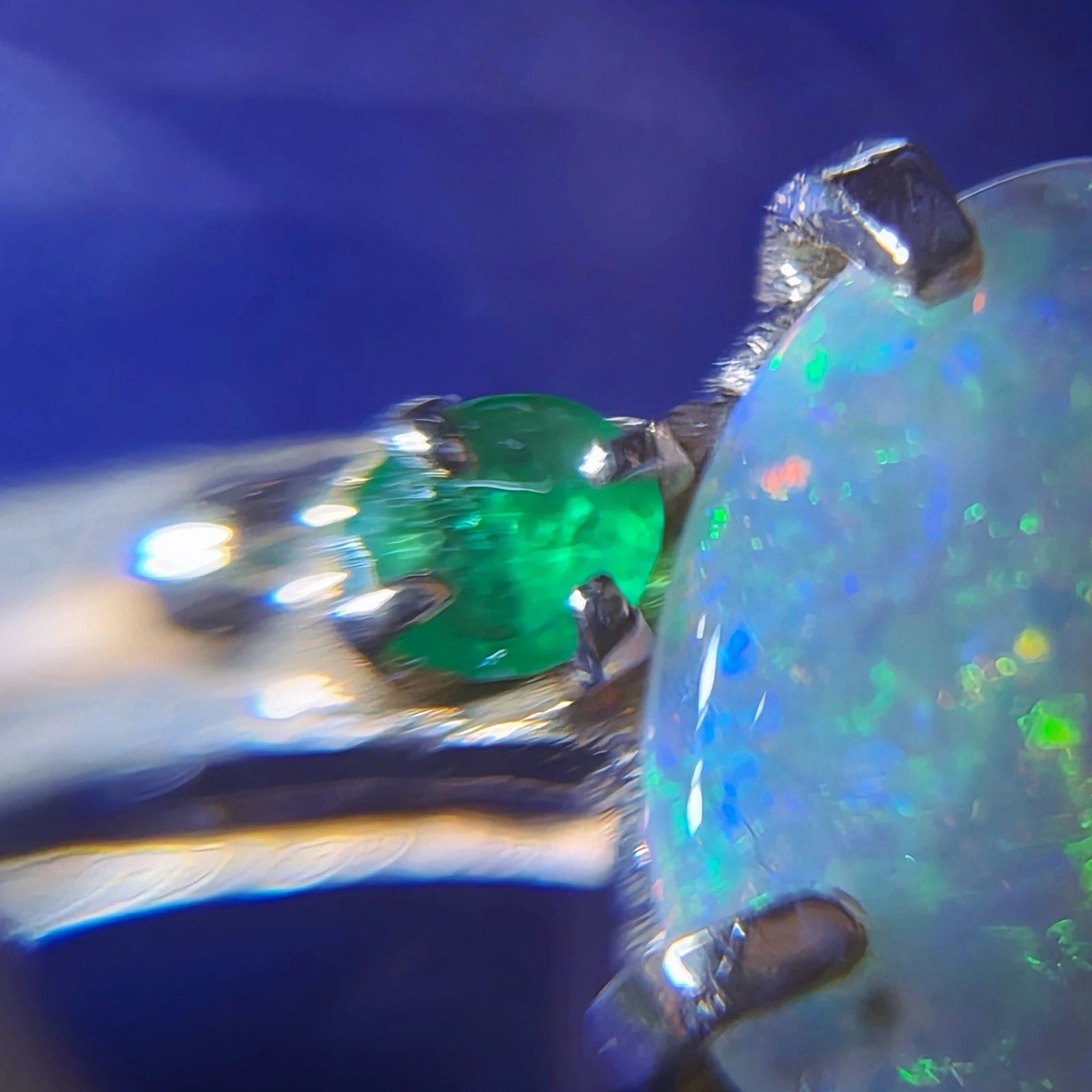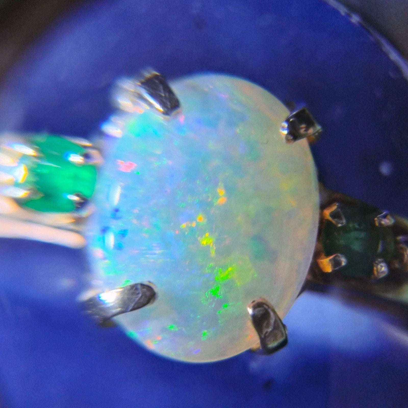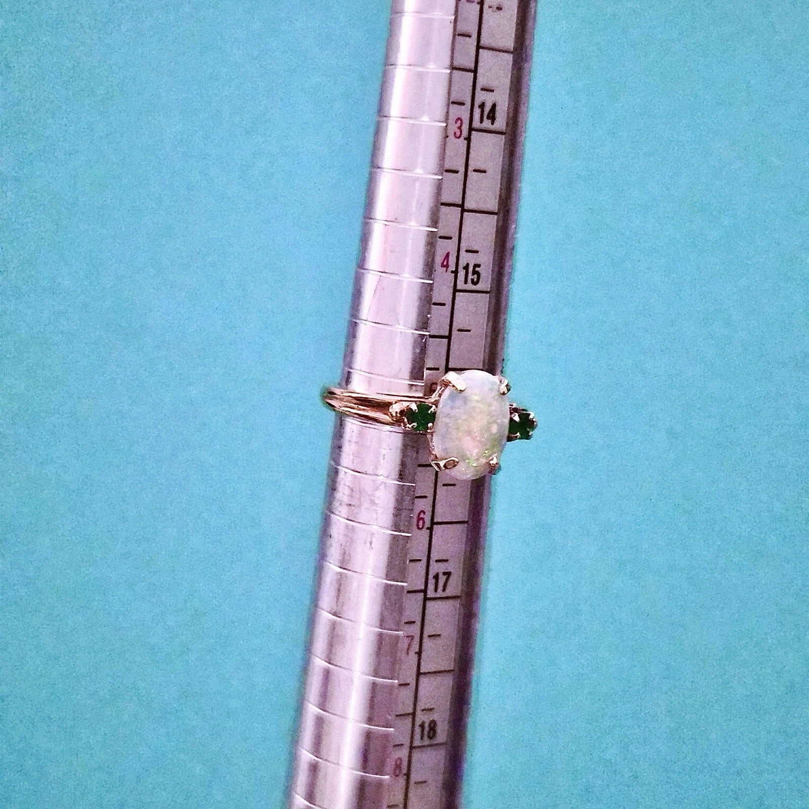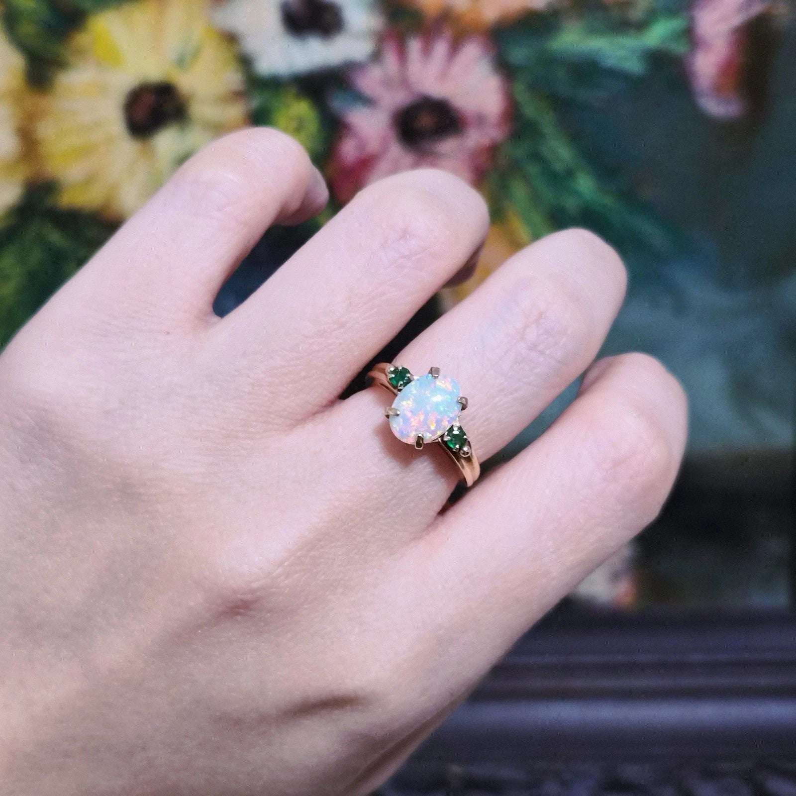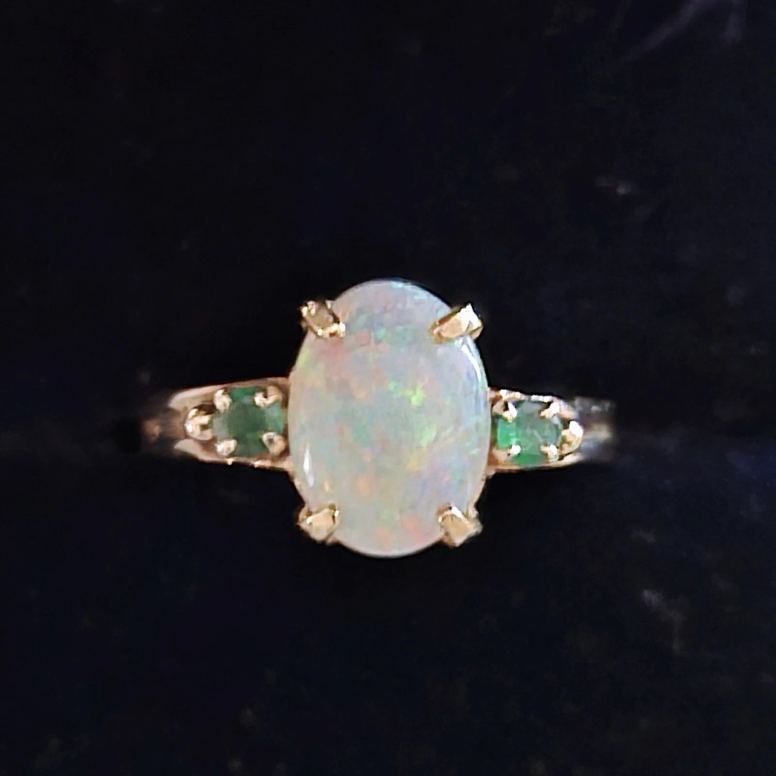 In vintage condition with light surface wear consistent with age. No major chips or damage noted on the opal. Minor surface abrasion on the emerald side stones, only visible under 10x magnification.