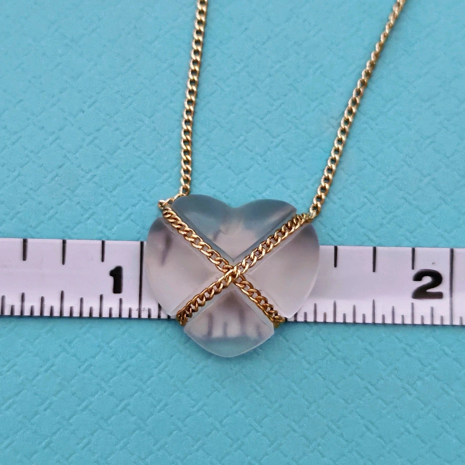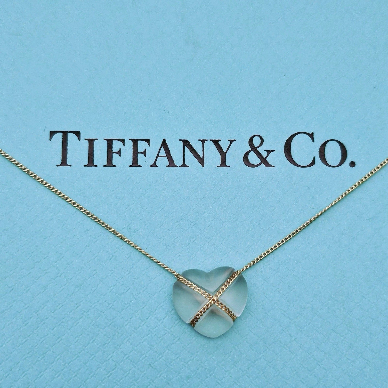 A rare and retired Tiffany & Co. necklace featuring a carved rock crystal heart embraced by an 18k yellow gold crossover “X” motif. Elegant, luminous and collectible—an iconic Tiffany design no longer in production.