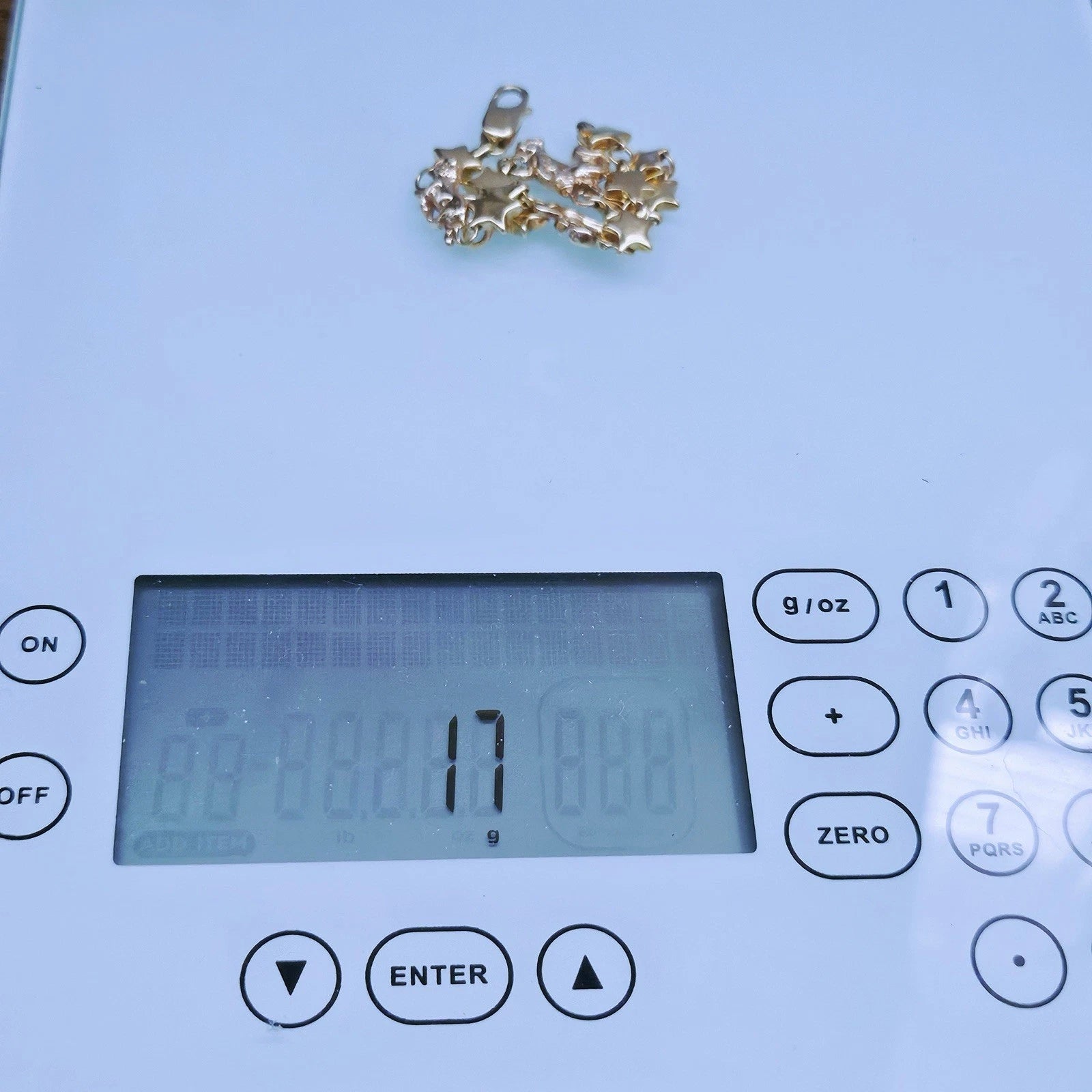 Crafted in solid 18k yellow gold, the bracelet weighs approximately 17 grams and measures 8 inches in total length. You can adjust the length by hooking the clasp onto a different link, just like I demonstrated in the video.