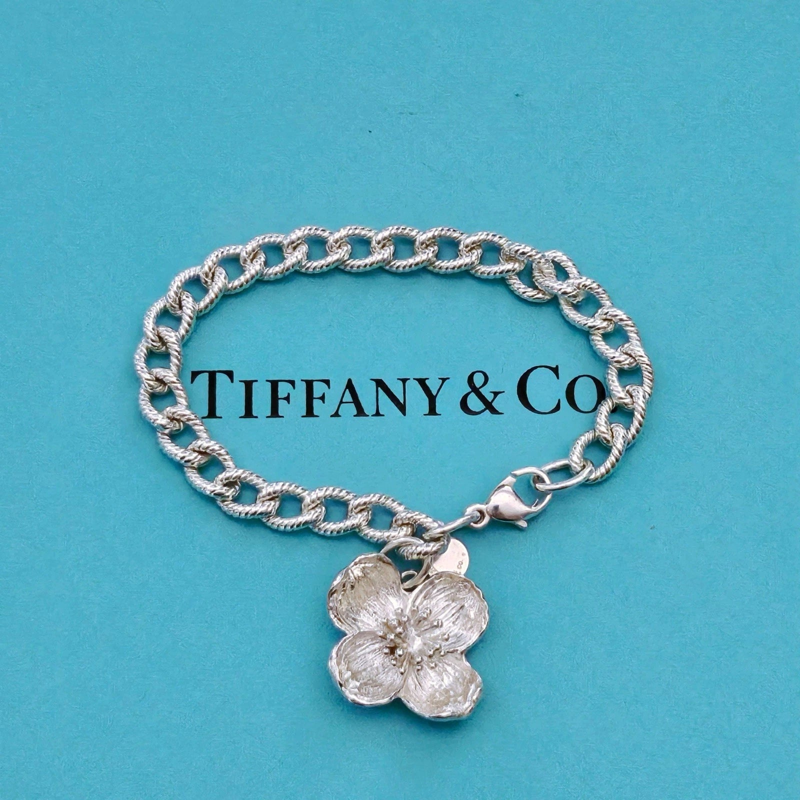 A timeless piece from Tiffany & Co., this vintage charm bracelet features a beautifully detailed Dogwood flower charm in sterling silver. The rope-style chain adds texture and elegance, secured with a sturdy lobster clasp. A rare and hard-to-find design, perfect for collectors or anyone who appreciates iconic vintage Tiffany craftsmanship.