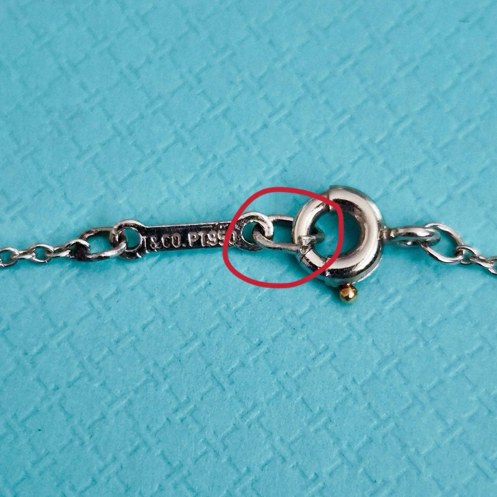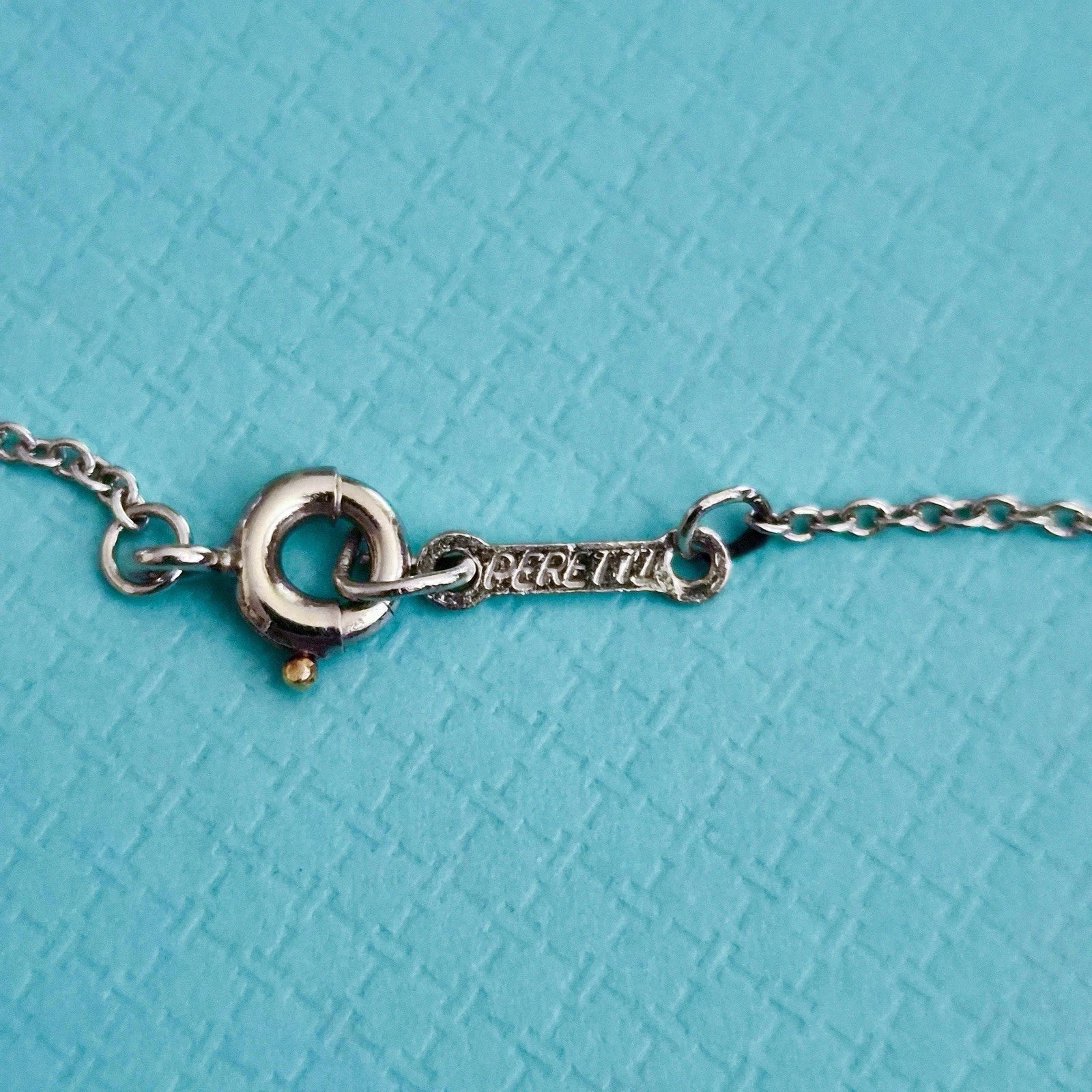 The original Tiffany “Fireworks” tag stamp was damaged and replaced with a Peretti-stamped tag. One connecting loop near the clasp remains unsoldered (see close-up photo). You can also choose to have the loop soldered or simply remove the replacement tag if you don’t prefer the alternative. Aside from these points, the necklace remains in original vintage condition. Selling as is.