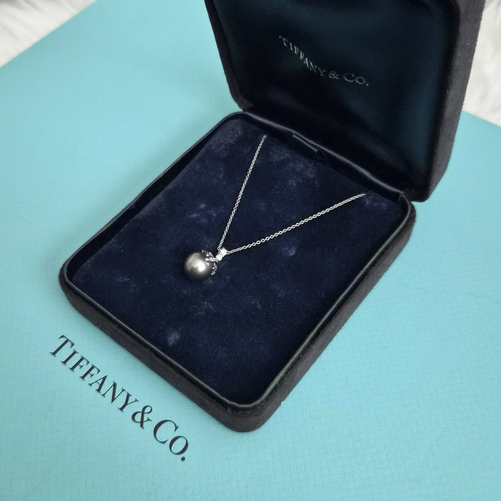 A highly collectible vintage Tiffany & Co. necklace crafted in platinum, featuring a luminous Tahitian cultured pearl measuring approximately 10.0mm–11.0mm. The pearl is suspended from a platinum Fireworks motif cap pavé set with twenty-two round brilliant cut diamonds weighing approximately 0.15 carat total, E–G color range, VVS–VS clarity. Chain length is 16 inches.