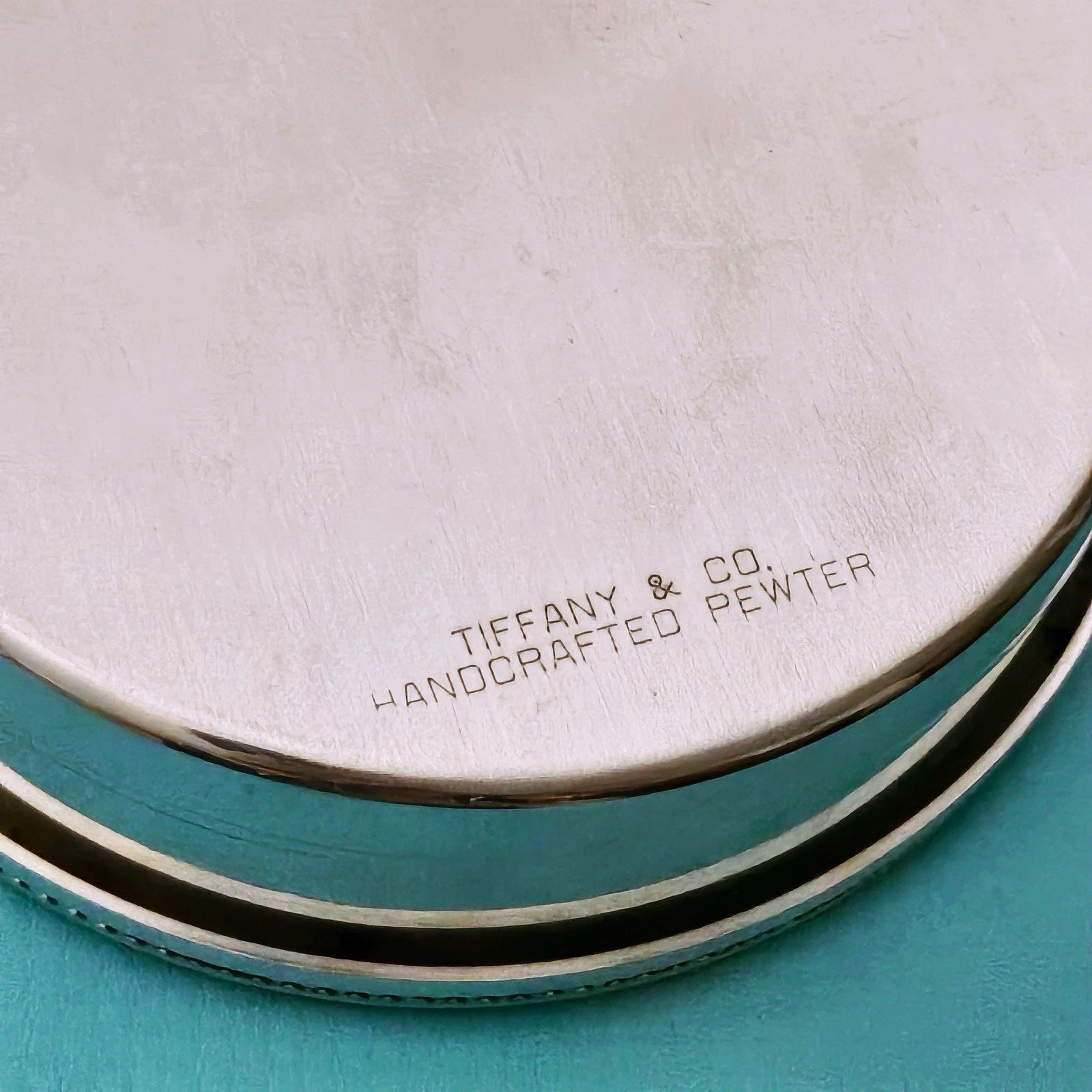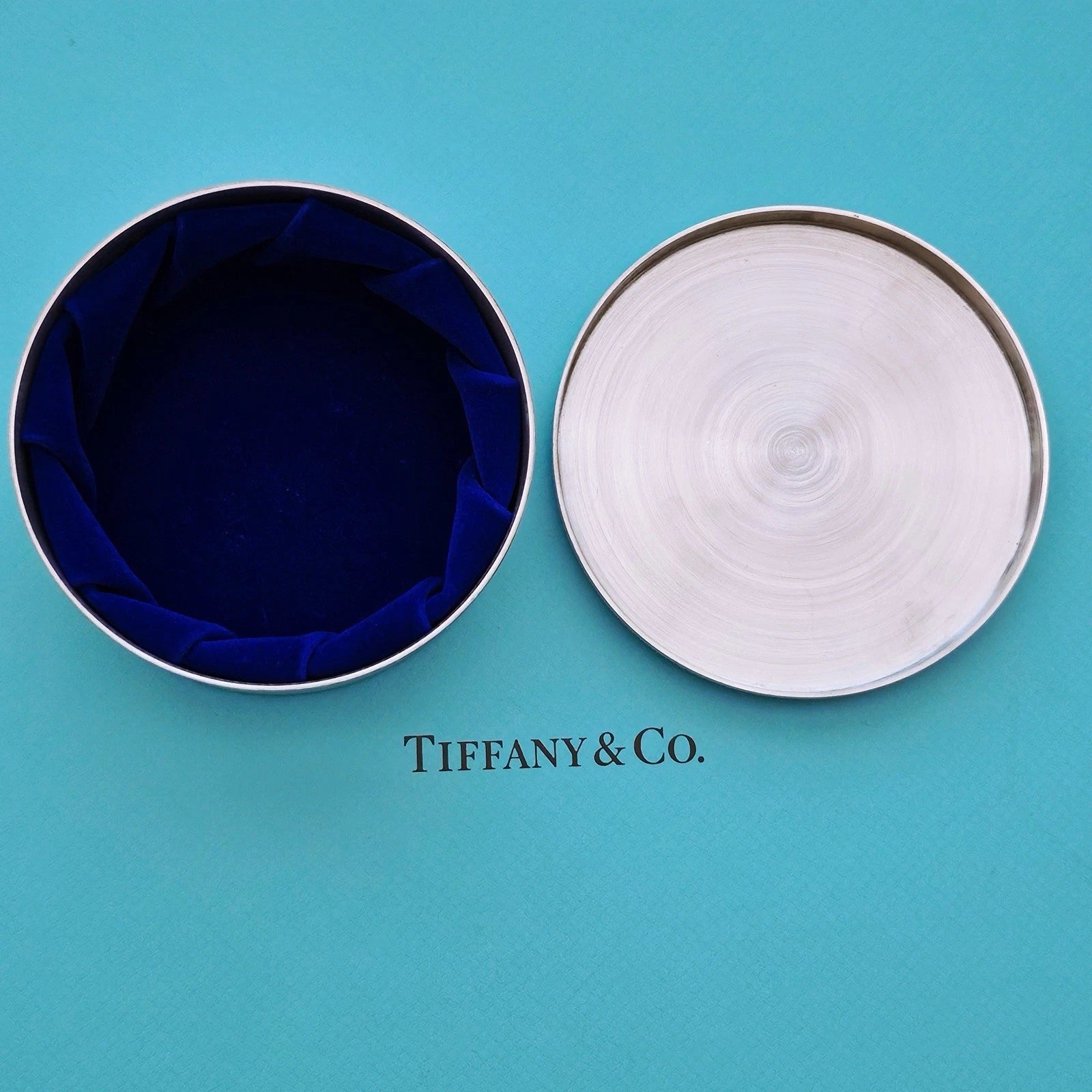 Vintage Tiffany & Co. silver tone handcrafted Pewter jewelry trinket box with blue velvet lining inside. A great addition to any Tiffany’s collection.
